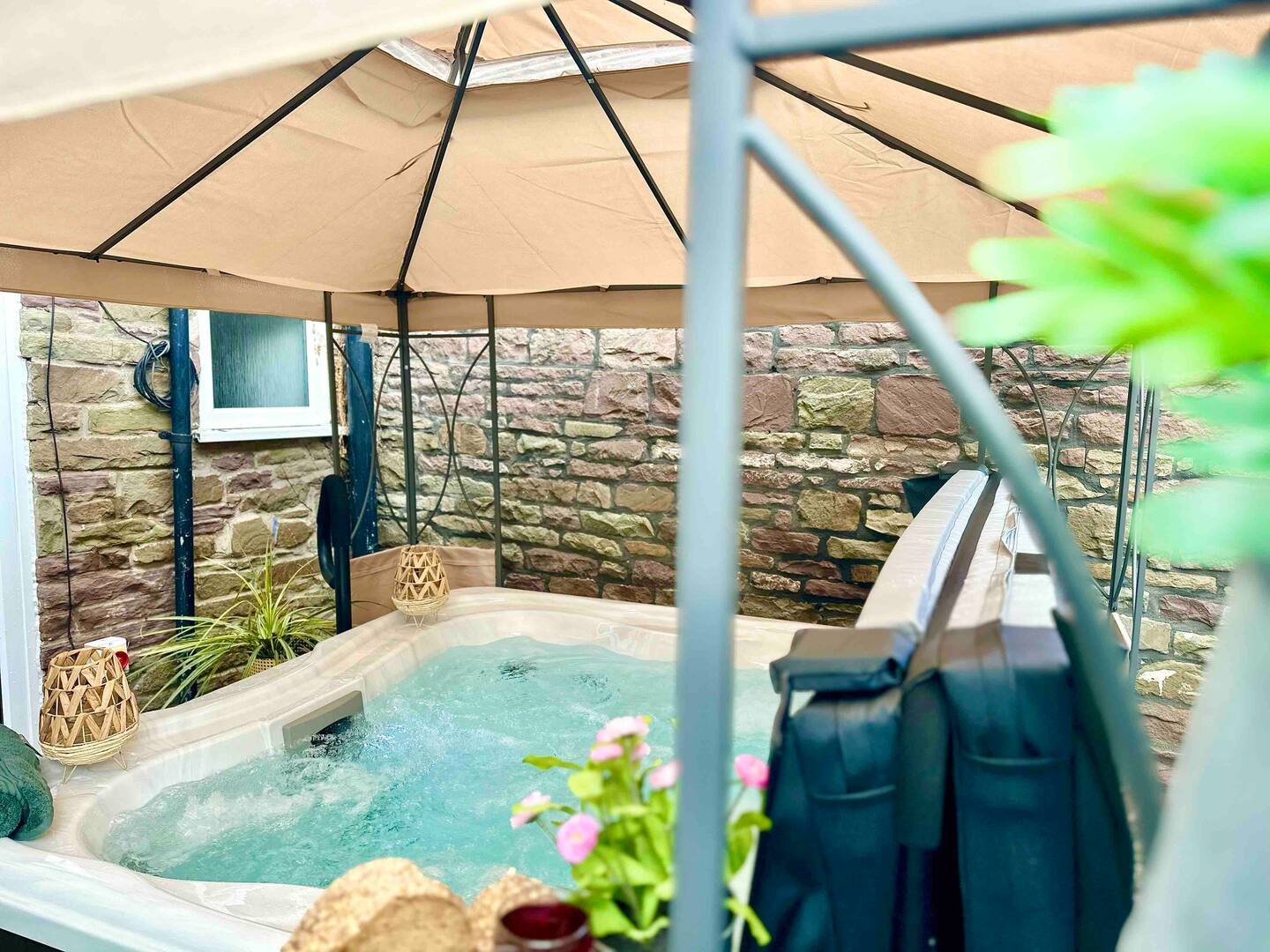 2 wide and deep stone steps lead us up to a fantastic size dining reception which has double doors opening onto the rear courtyard which holds a lovely 6 person hot tub covered by a large gazebo and is a wonderful way to relax in private in any weather, against the lovely back drop off an original stone high built wall and rear access gate.