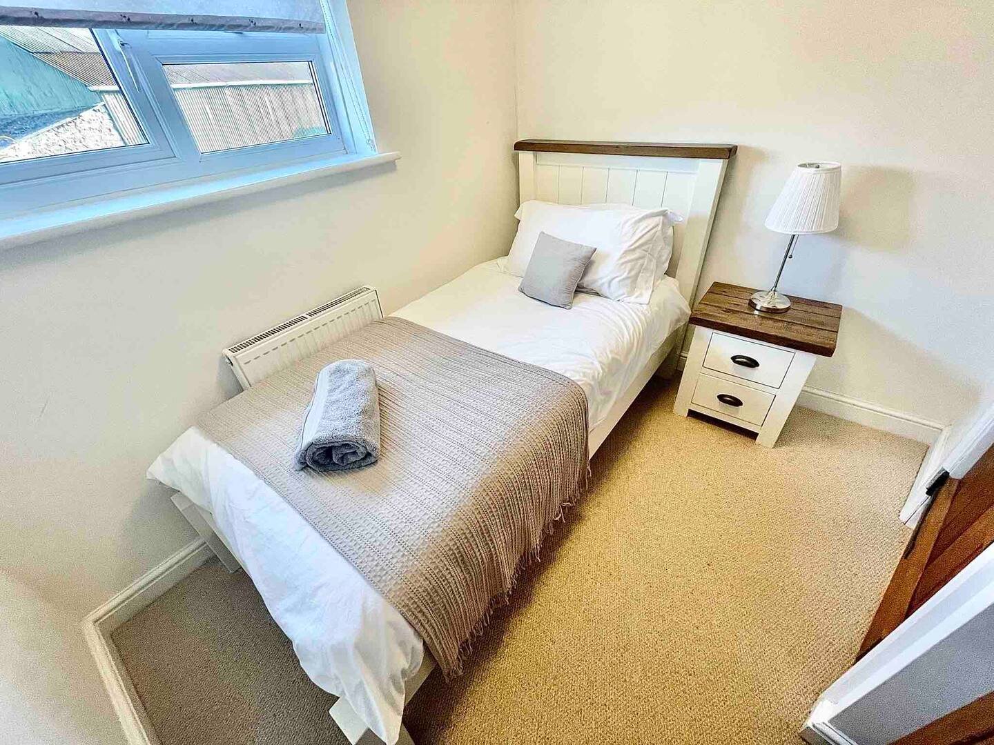 From here are all 3 bedrooms, a super king size master, with a solid oak super king size bed, a double twin with solid oak single beds and a single room with a single bed.
