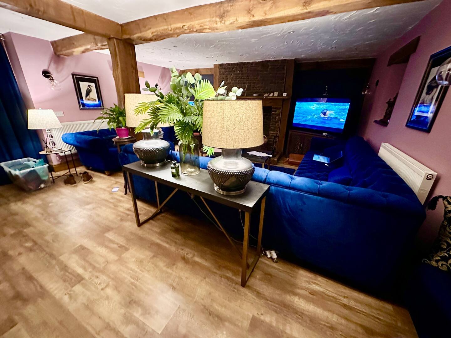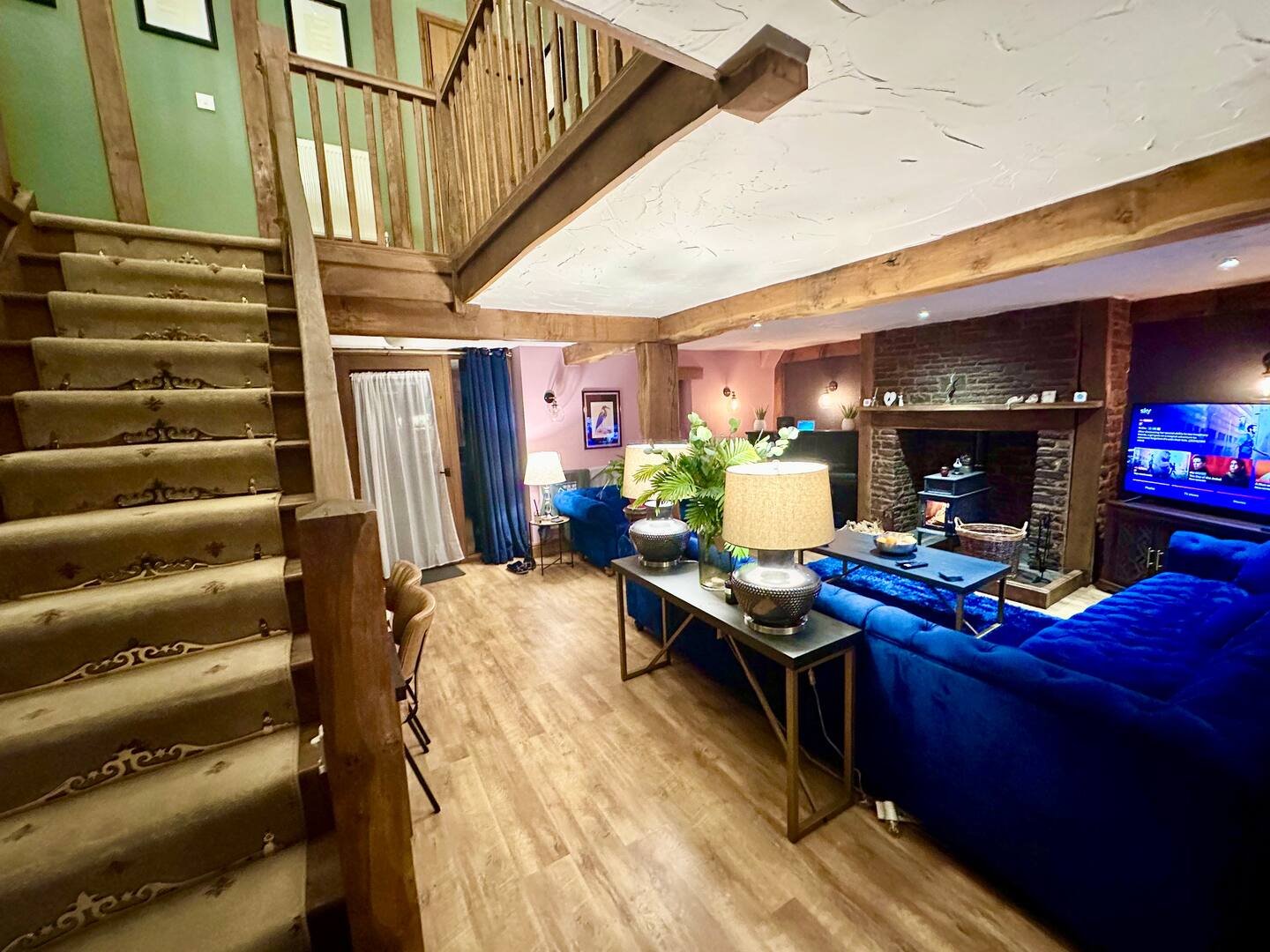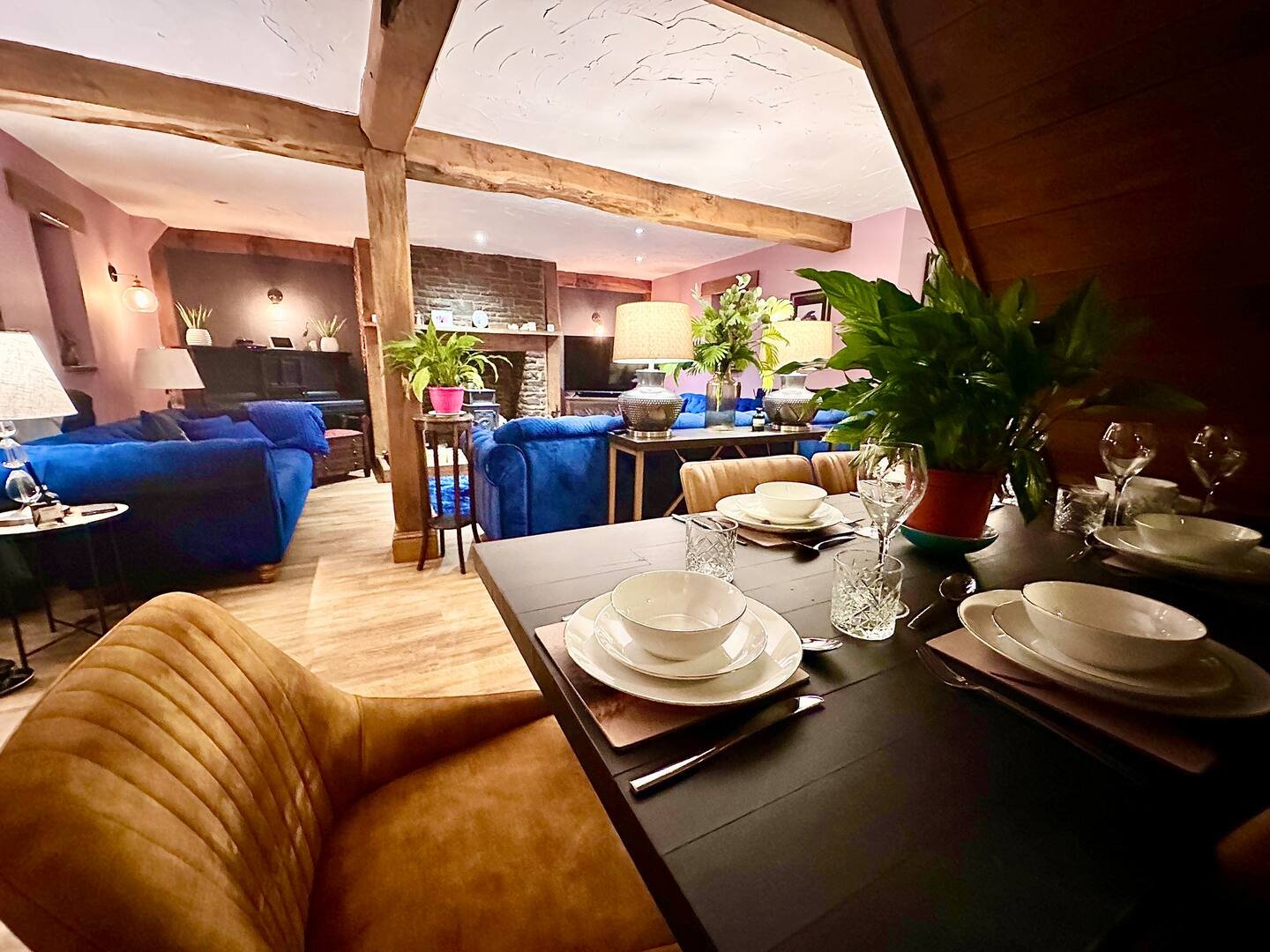 There is a a 65-inch TV equipped with full Sky Glass, an Echo Show, and a surround sound system to enhance your viewing experience. The dining area is thoughtfully prepared for a party of six, offering an inviting space to enjoy meals together.