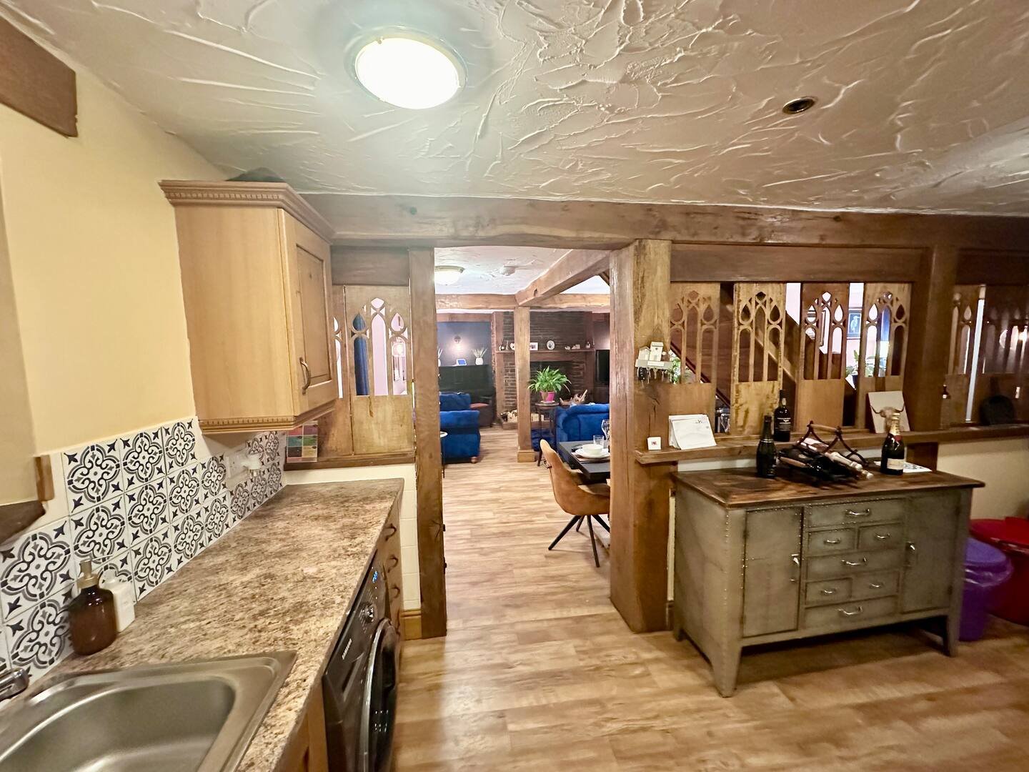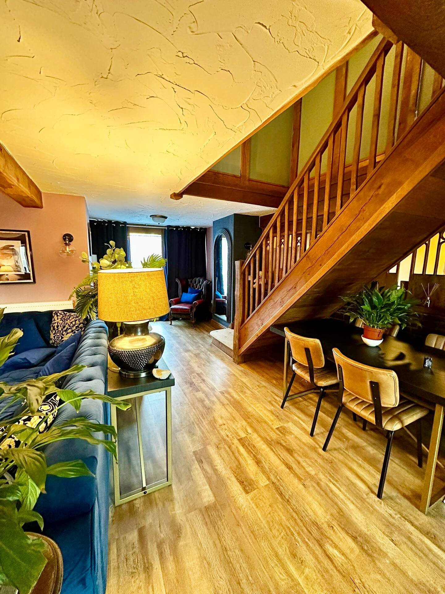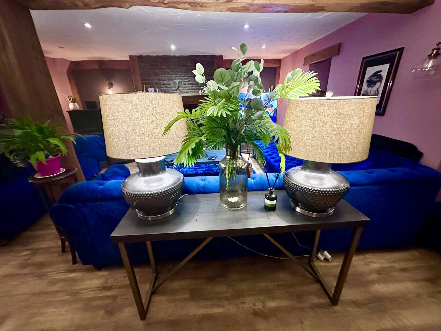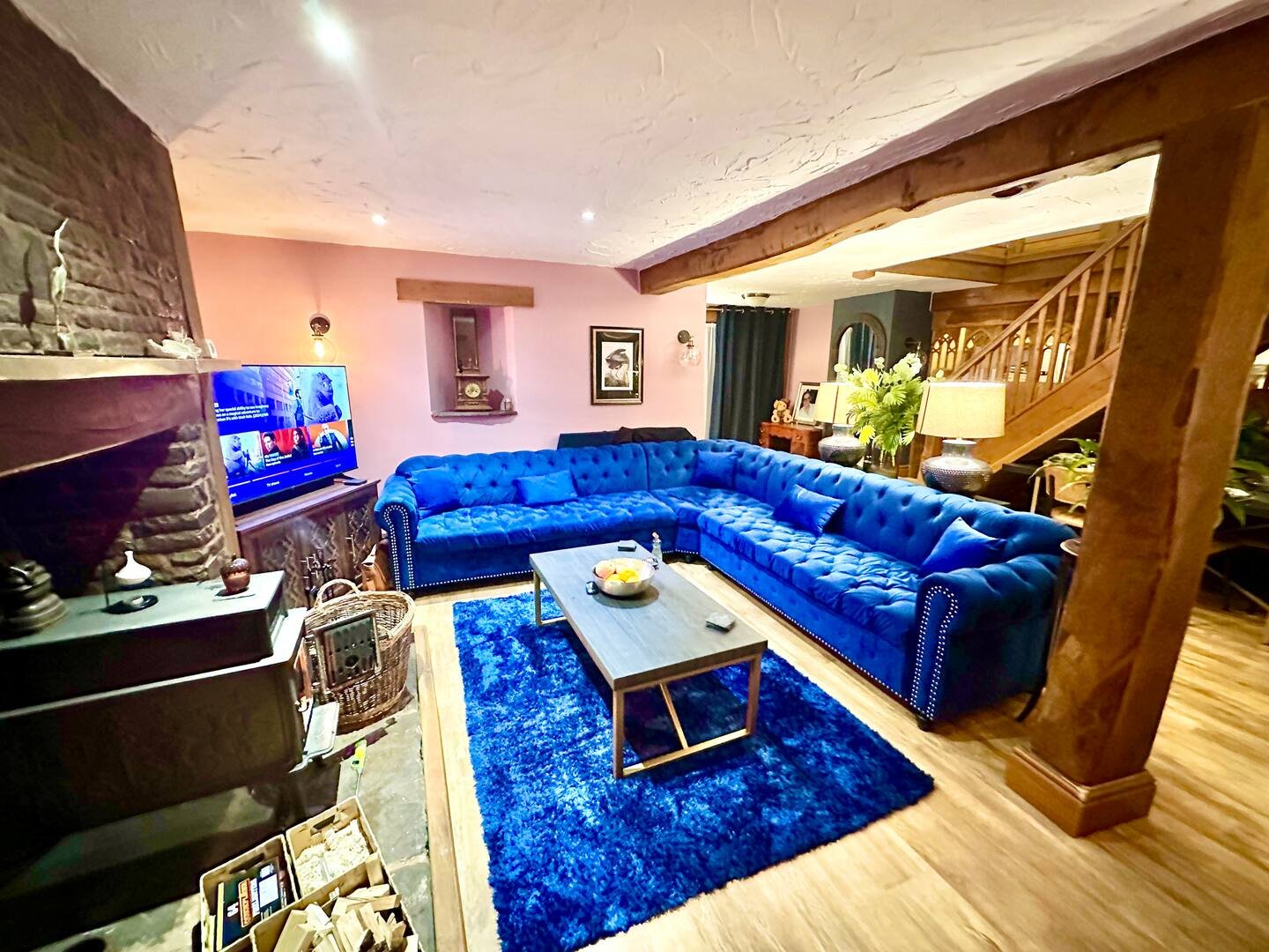 The spacious lounge is perfect for unwinding, featuring Alexa-controlled lighting, a stunning 9-seater corner Chesterfield sofa, an additional 3-seater Chesterfield, and a cozy log burner for those chilly evenings.