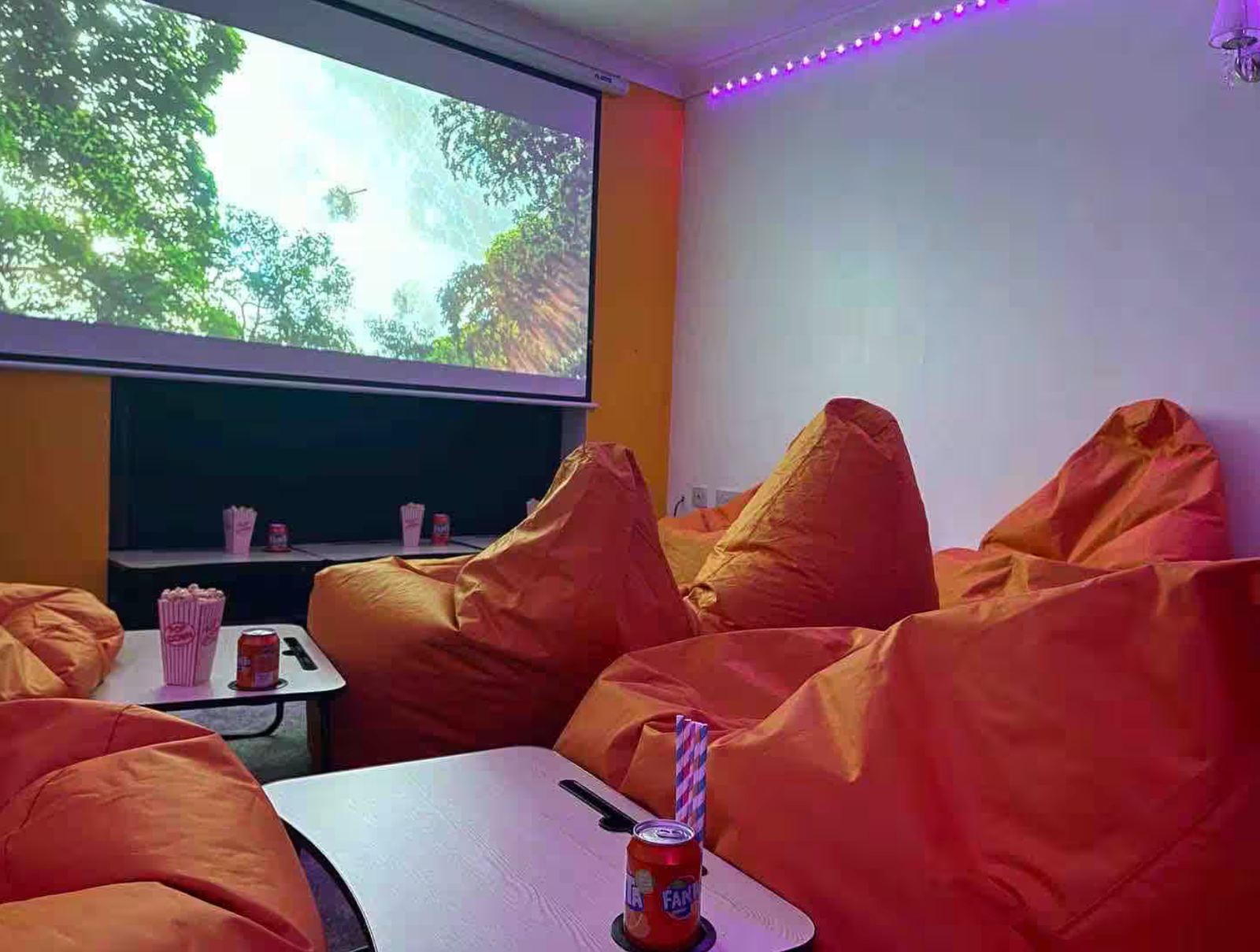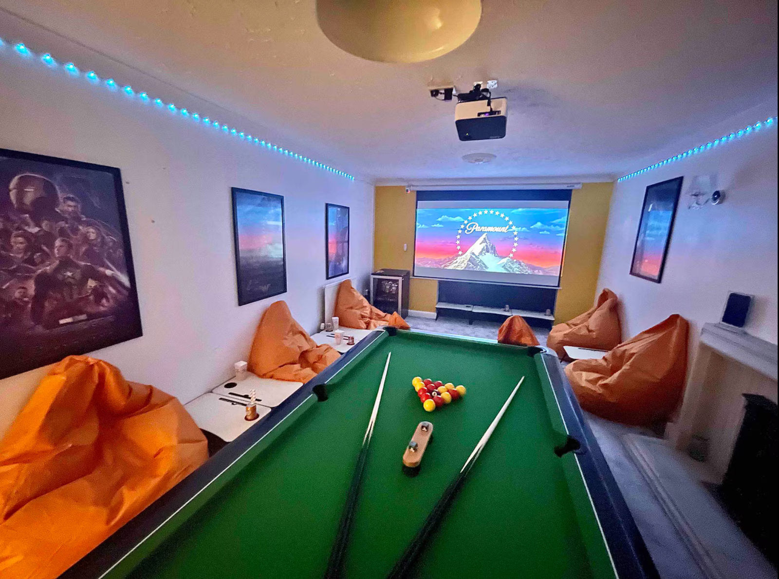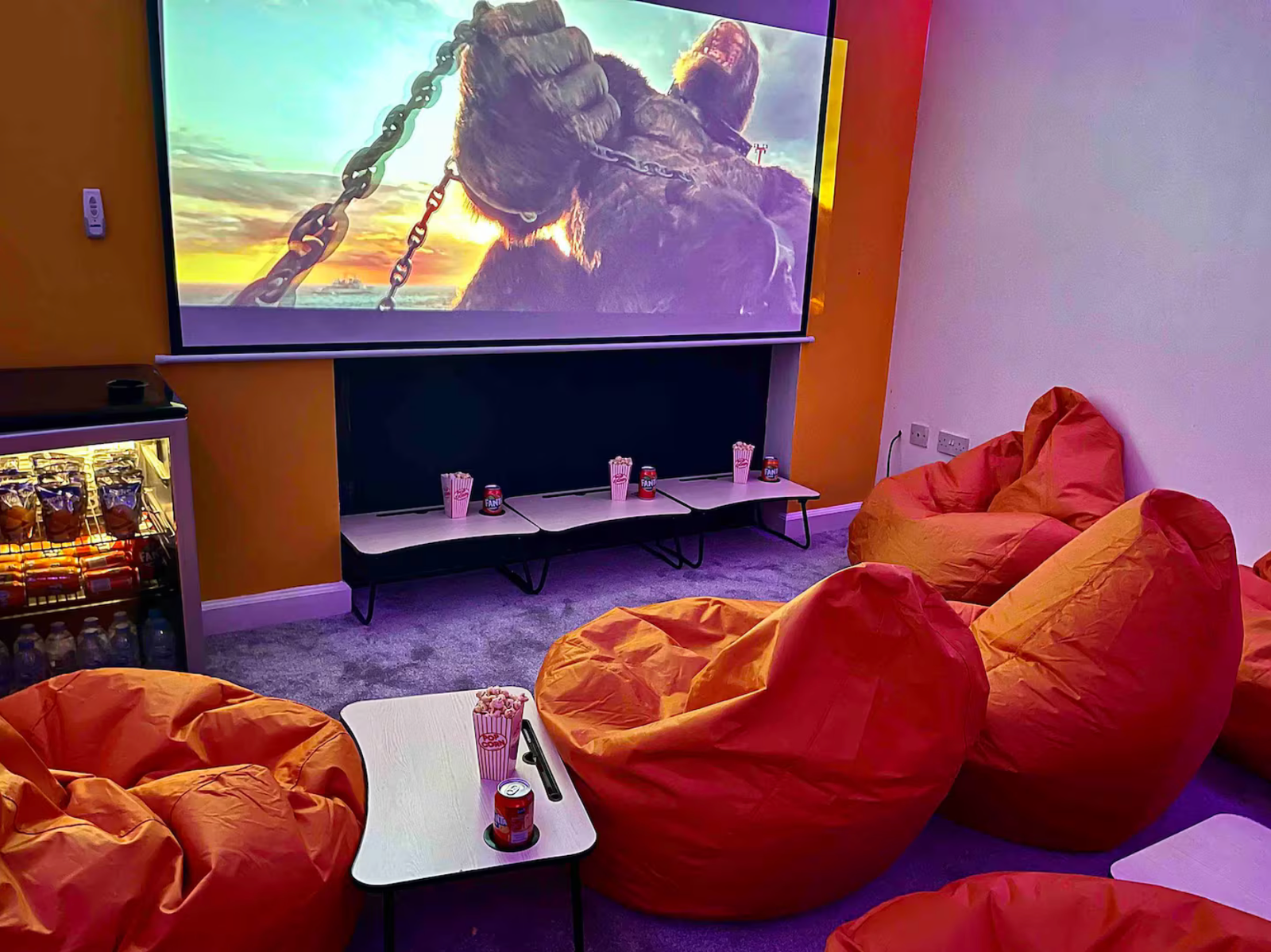 The large brand new cinema room/games room is suitable for up to 8 people to watch a movie on bean bags with side tables and a drinks fridge, popcorn boxes and paper straws are also provided.