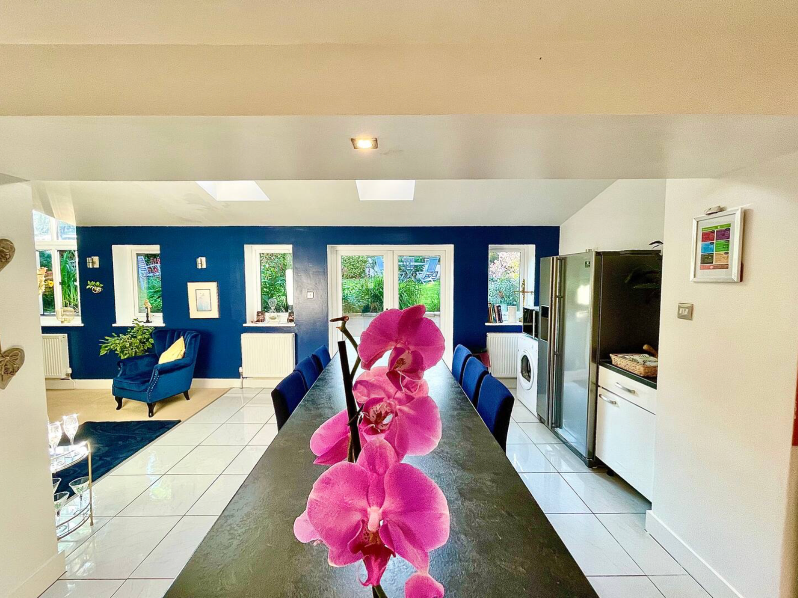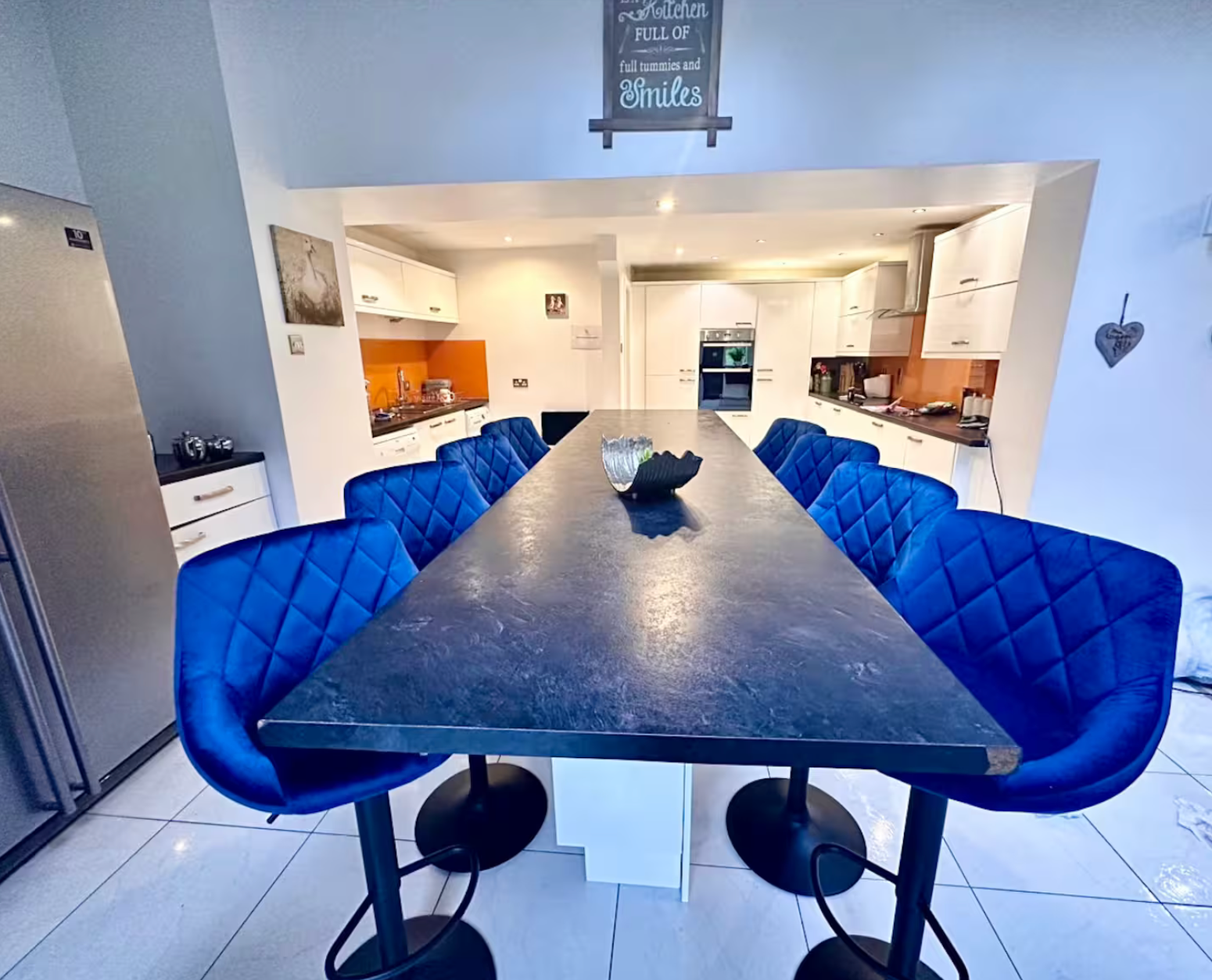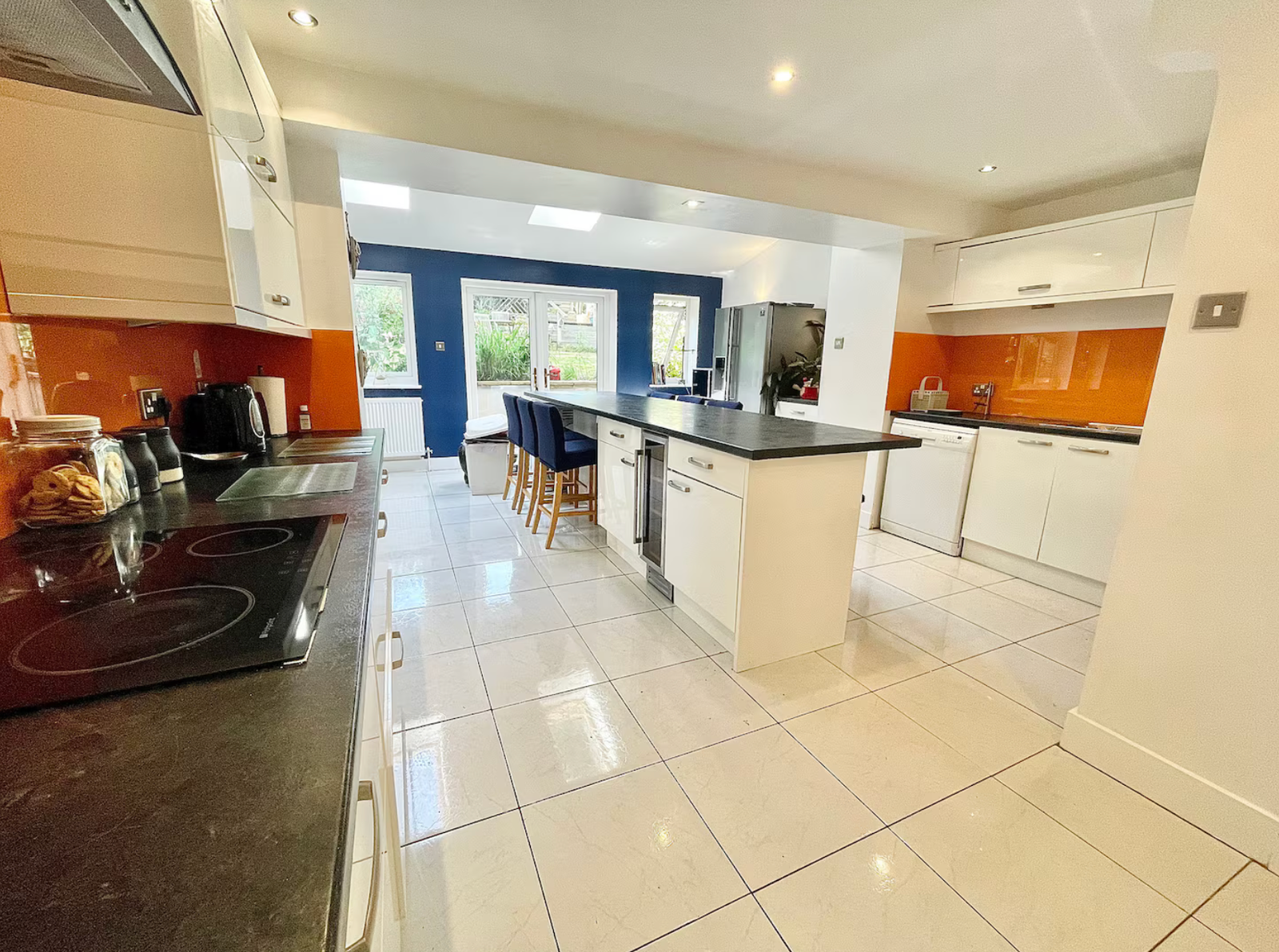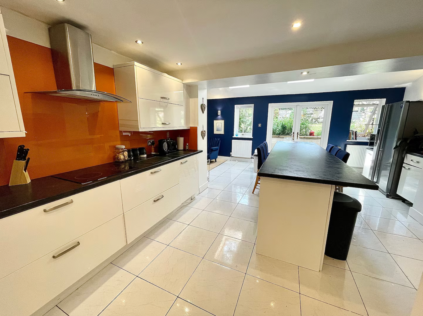 The kitchen is a superb size and wraps around to the side of the grand reception and seats 8 people at the breakfast bar.